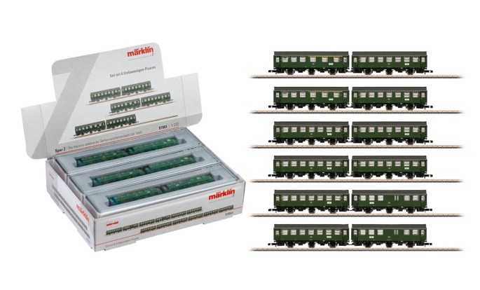Dieses Set enthält 6 Pärchen dieser markanten Wagen die jeweils einzeln verpackt in einer Display-Verpackung erhältlich sind. Dabei ist jede Gattung 2x mit unterschiedichen Betriebsnummern enthalten. 2x 1./2. Klasse AB3yge; 2x 2. Klasse B3yge und 2x 2. Klasse mit Gepäckraum BD3yge